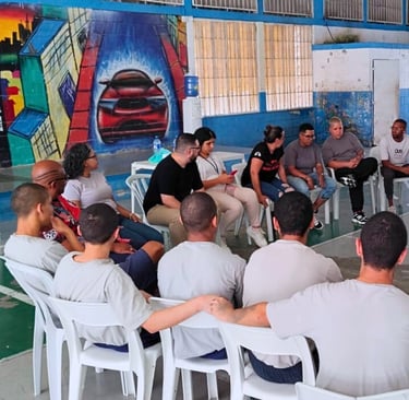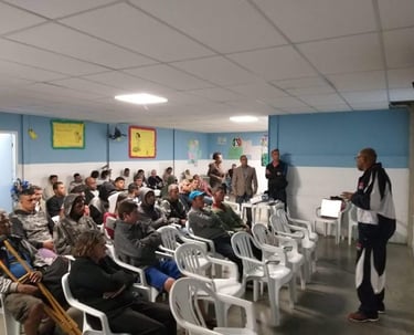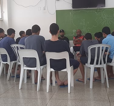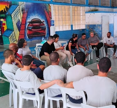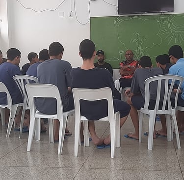 Bate-papo com psicólogos voluntários e o ex-presidiário Maurício Monteiro, que compartilhou sua trajetória no sistema prisional. O encontro abordou temas como direitos humanos, racismo estrutural e a importância da educação na construção de um novo futuro. A atividade proporcionou reflexões sobre escolhas, oportunidades e a prevenção da reincidência, reforçando o papel do diálogo e do conhecimento na transformação social. Janeiro de 2025.