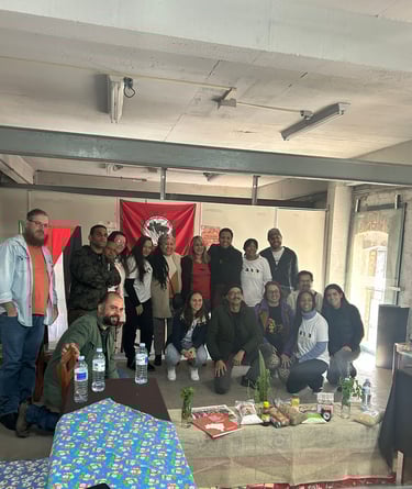A aula, que aconteceu no Espaço Cultural Elza Soares, contou com a presença de Ademar Schusk do MST, Carmen Silva (@carmensilvamstc @cozinhaocupacao9dejulho), Helen Baum (@helen.baum @memoriacarandiru), Fábio e Júlia, do Instituto Chão (@institutochao).